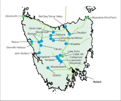 Today we show fossil-fuel free Tasmania, again courtesy of the AER’s annual State of the Energy Market report, and this state is, of course, dominated by hydro (in blue) and with some wind energy (green). There is no coal, no large scale solar (yet), no grid scale batteries, and the last of the gas generators is also not included in this map.