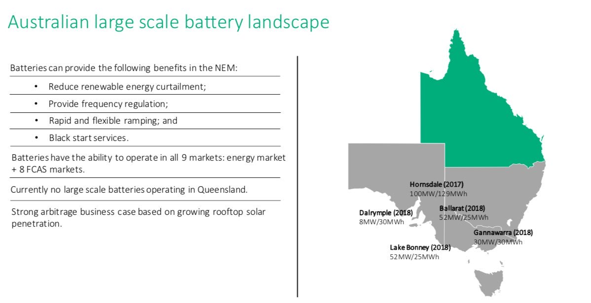 The Genex presentation says there are currently no large scale grid-scale batteries in Queensland (well, actually there are two small ones at Lakeland and the yet to be commissioned Kennedy in the far north), and they will be able to provide frequency regulation, reduce renewable energy curtailment and support rapid and flexible ramping, along with “black start” services.