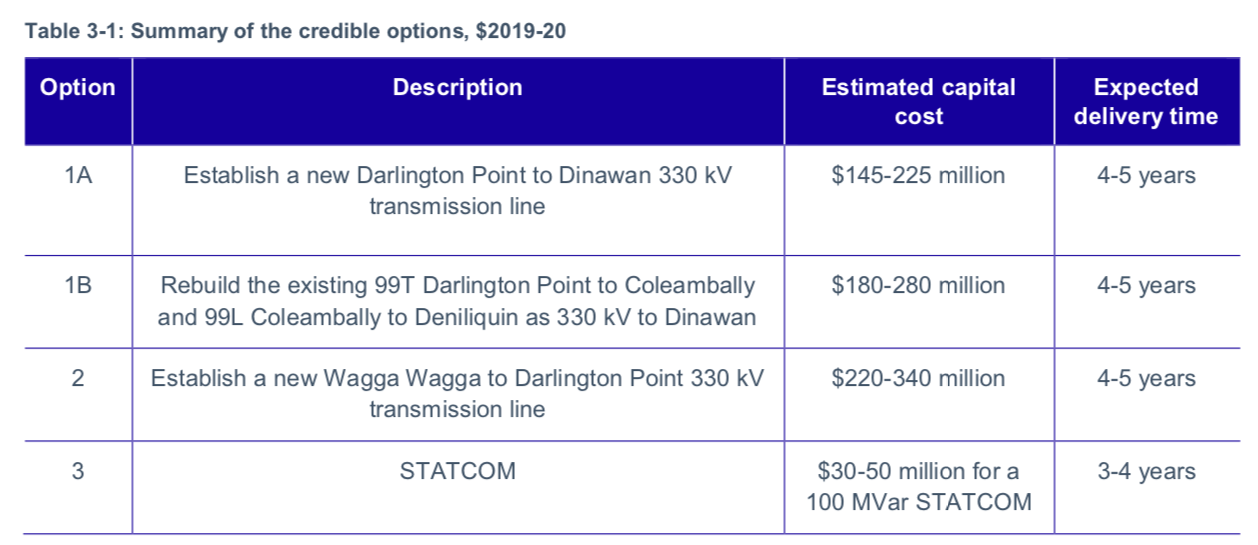 Transgrid suggests four options to solve the problem, and these include a bunch of additional network spending. The three network additions or upgrade options put forward will cost between $145 and $340 million, which Transgrid argues will deliver “clear market” benefits because of the amount of output that would be lost otherwise.
