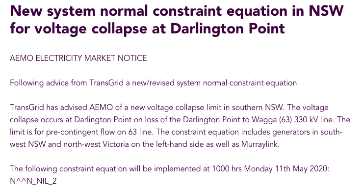 It is not clear how the constraints would be imposed on the plants operating in the area. The market notice issued by AEMO does not make this clear, although it suggests the constraint could also impact solar farms in north-west Victoria, which only recently emerged from a 7-month restriction on 50 per cent of their output caused by separate voltage issues.