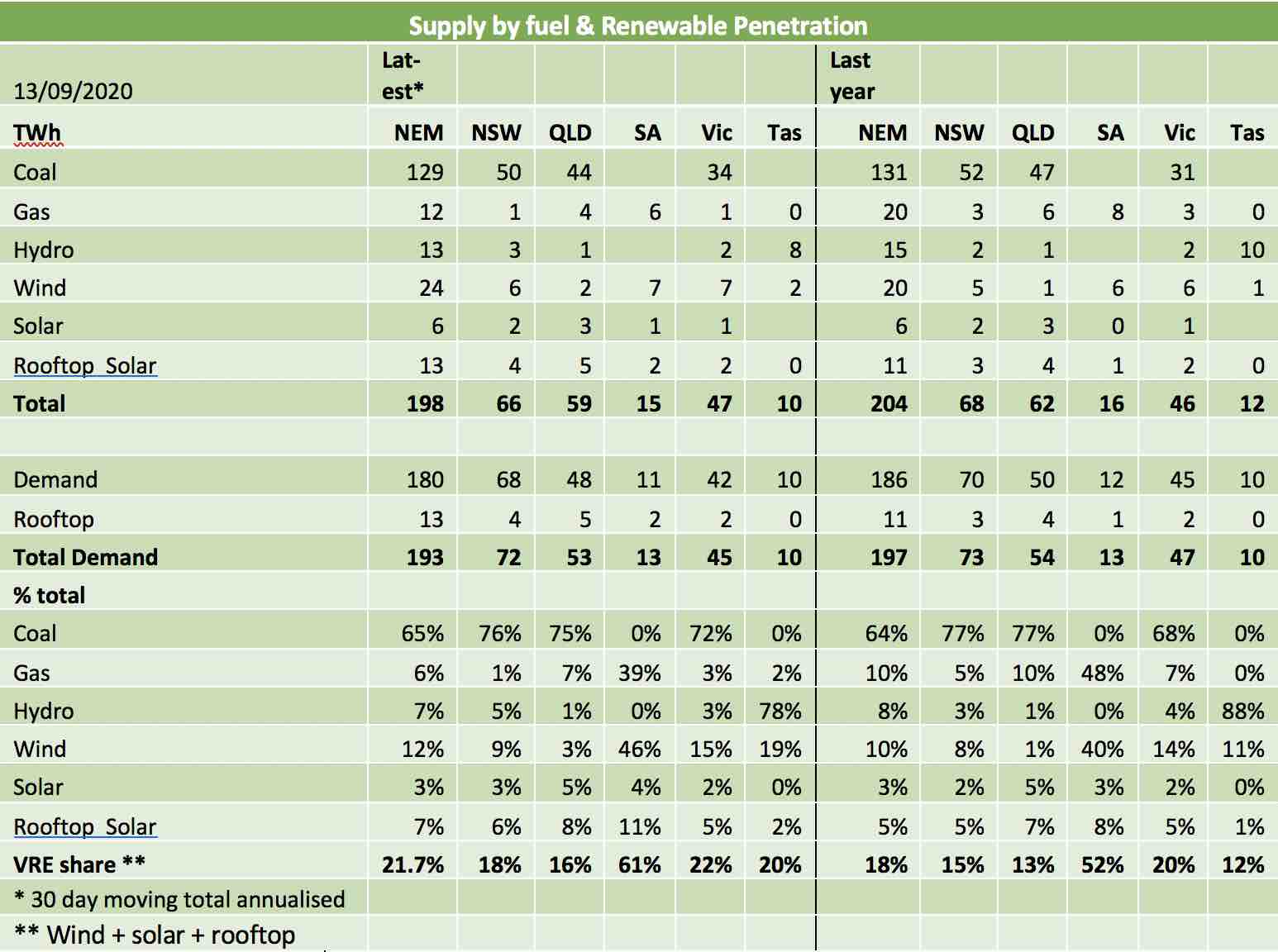 As the table above shows, and as everyone has been forecasting for years, because of the lack of a carbon price, it’s gas that is getting displaced with its share of the Victorian market having more than halved. Even in South Australia gas generation supply is down by one quarter.