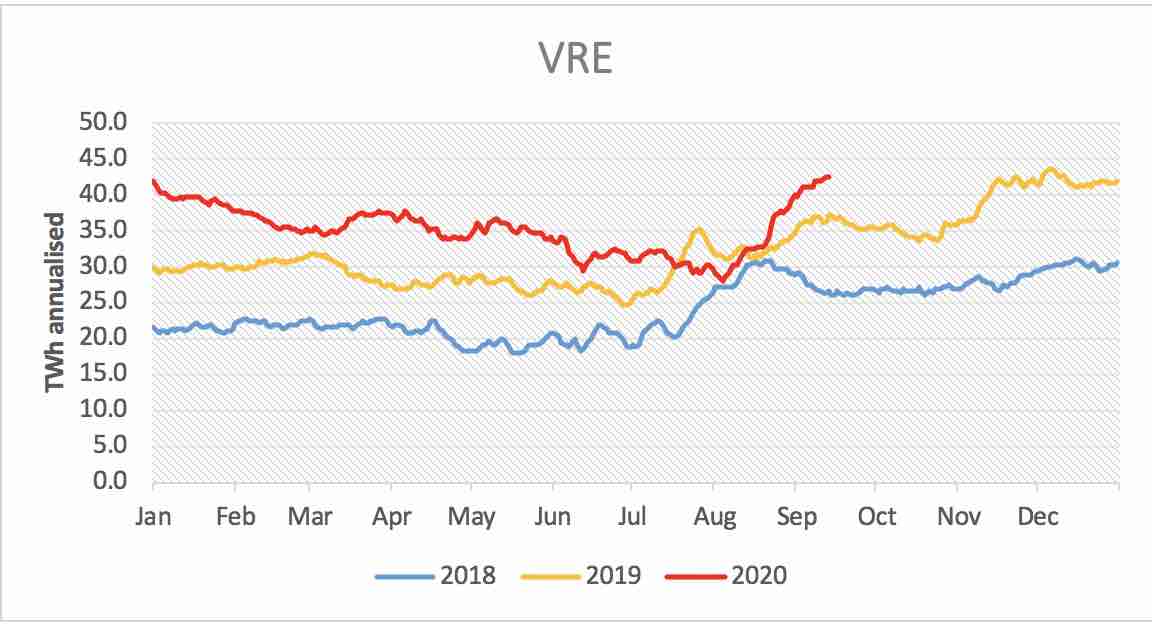 Wind and solar, or variable renewable energy (VRE) has taken off in what is still only early Spring, to push their share of total demand to around 22 per cent across the NEM in the last month.
