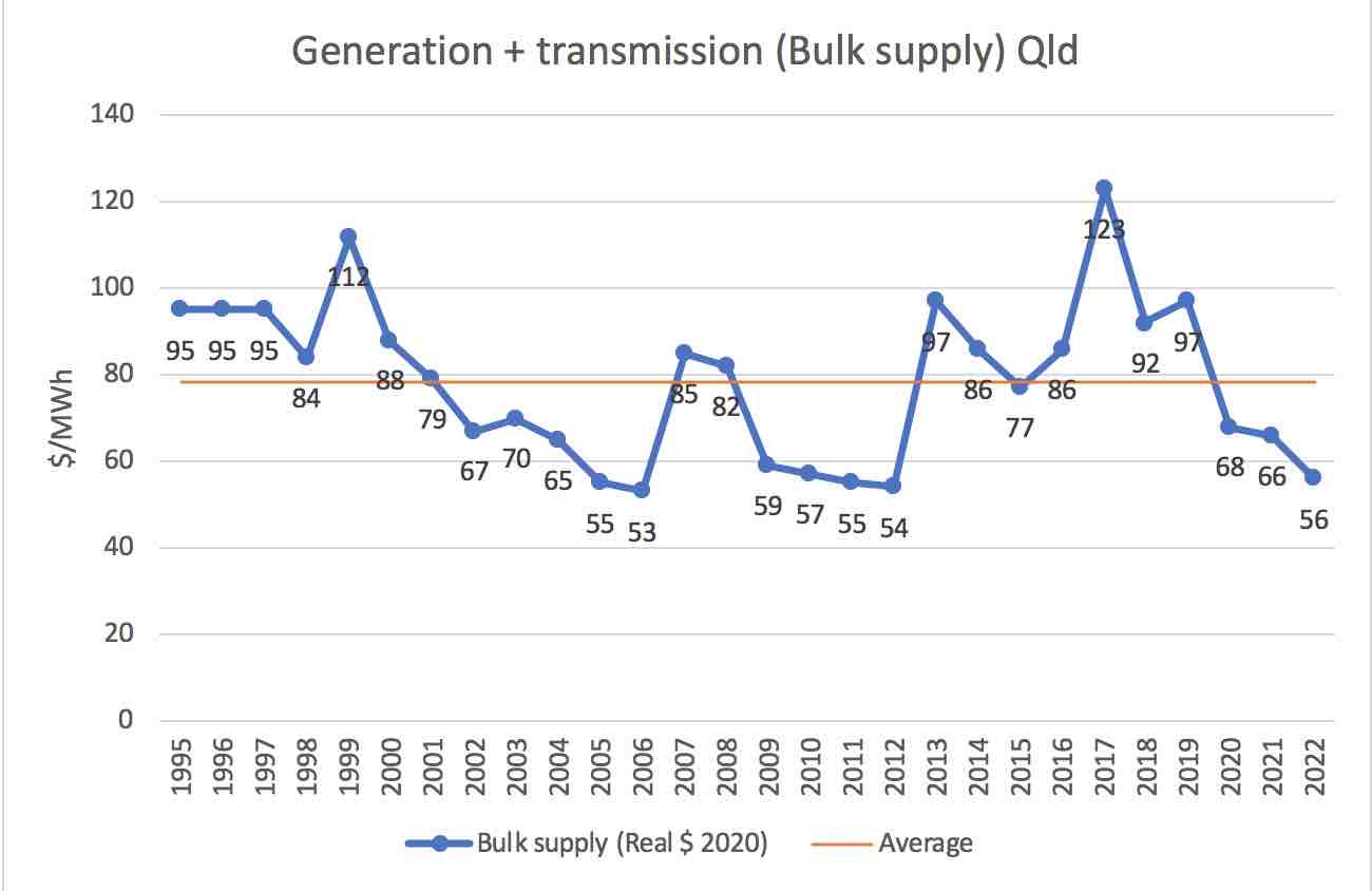 The chart shows, inflation adjusted prices (2020 is nominal base) with Qld transmission costs added, but excludes last mile distribution costs.
