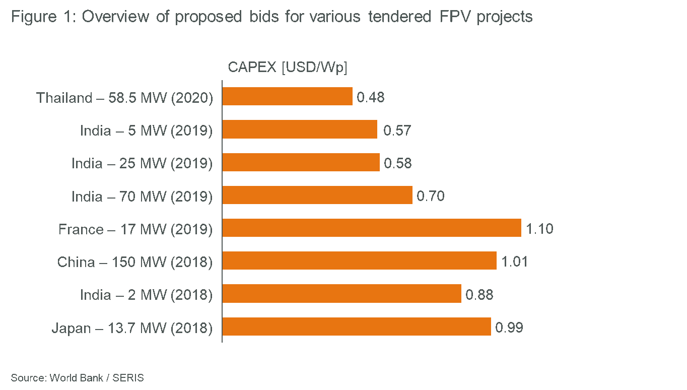 Usually water bodies are subject to increased scrutiny measures imposed by relevant governmental authorities, hence developers might be required to regularly conduct comprehensive environmental impact assessments (EIA), which might be an additional cost driver. In general, the CAPEX of FPV systems are currently around 5–15% higher compared to a ground-mounted PV system, but in some European countries, a 20+ MW system is already considered competitive. Below in Figure 1 is an overview of proposed bids for various tendered FPV projects.