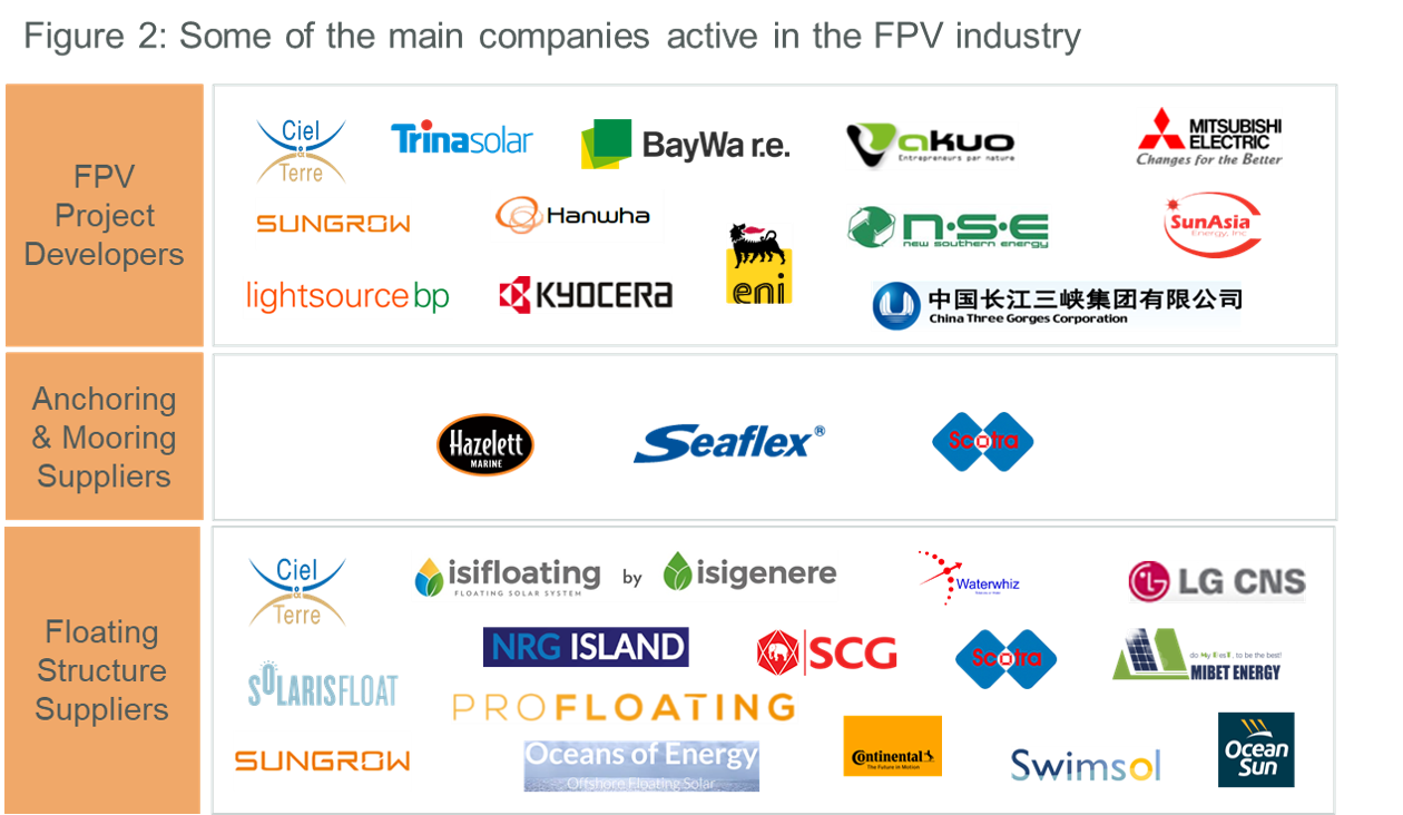 Despite the fact that FPV systems have been deployed for more than a decade, and while the vast majority of today’s 2.6 GW was only built during the last five to six years, the current state of knowledge regarding FPV systems varies considerably. Certain areas, such as PV modules, cabling, materials & components are well understood. In contrast, knowledge is still lacking in areas such as O&M procedures, long-term environmental impact, as well regulations and permitting. Other areas, however, are better understood, such as floats, mooring and anchoring, electrical layout, long-term energy yield forecasting and safety issues, thanks to extensive experience gained particularly in the maritime sector (see Figure 2 for an overview of some of the current players active in the FPV sector).