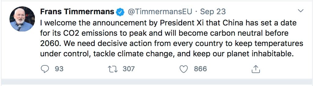 “I welcome the announcement by President Xi that China has set a date for its CO2 emissions to peak and will become carbon neutral before 2060,” said Frans Timmermans, the European Commission’s executive vice president responsible for the European Green Deal, in a Tweet on Tuesday.