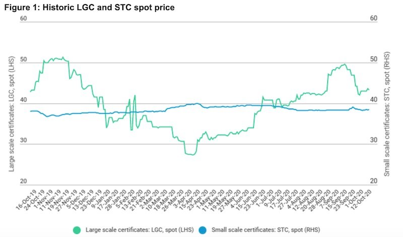 The shrinking differential between spot and forward prices suggests that participants are opting to pay penalty price instead of surrendering LGCs and deferring the obligation for up to three compliance years, when the LGCs can be purchased and acquitted with the $65 received back from the government.